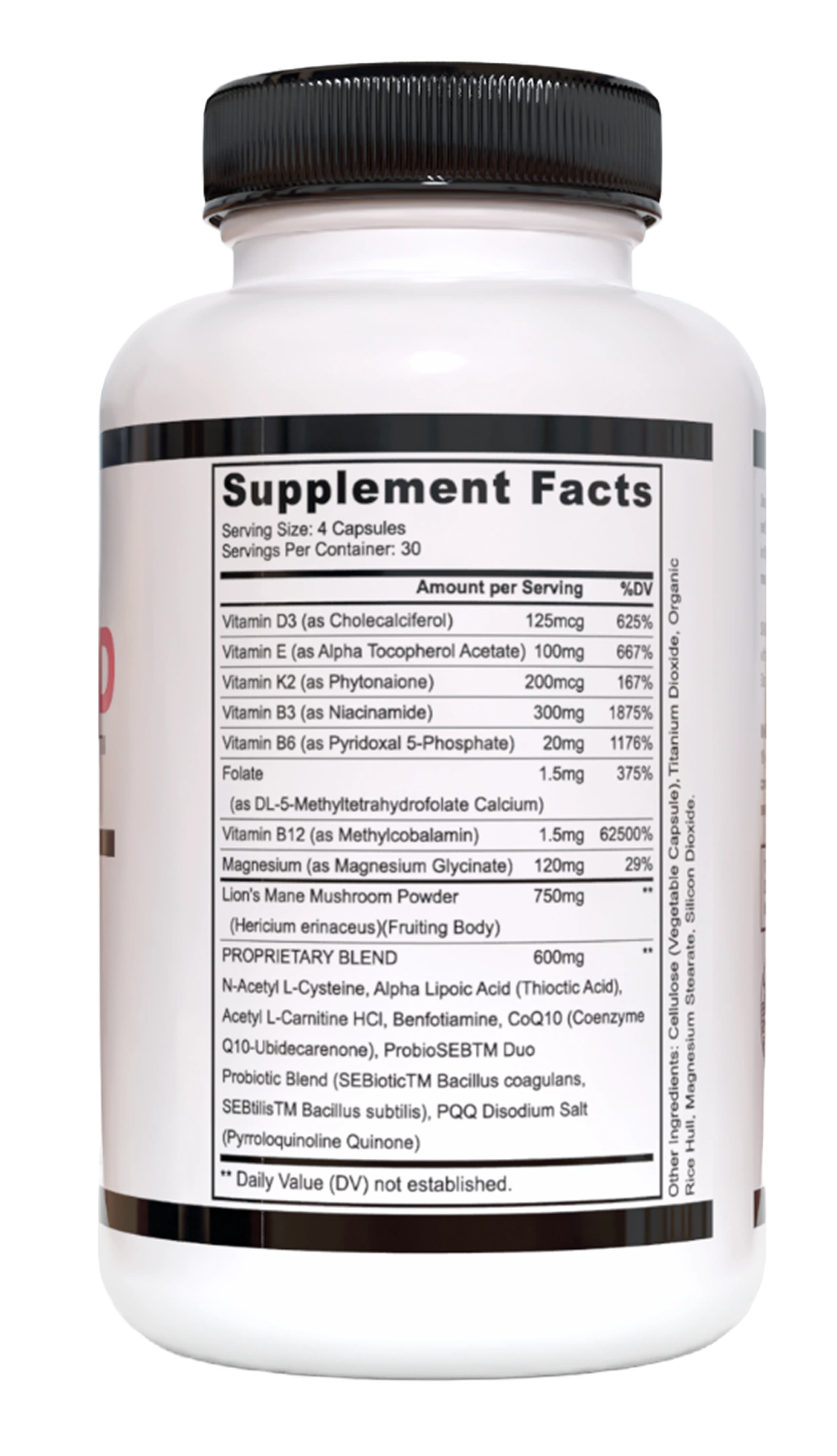 Armed with this information, we reformulated the product with slight tweaks to maximize the combined effect. Since we were no longer laboring our patients with so large a handful of pills, we went ahead and added another ingredient with marvelous benefits for our target patient audience: Lion’s Mane (from the fruiting body of the Hericium erinaceus) mushroom. The reason the dosage is now 4 capsules daily is that the blend is packaged in smaller capsules and includes the additional 750mg of Lion’s Mane, as has been used in clinical research. The bottles are also smaller, and there are now 120 capsules per bottle instead of 180.